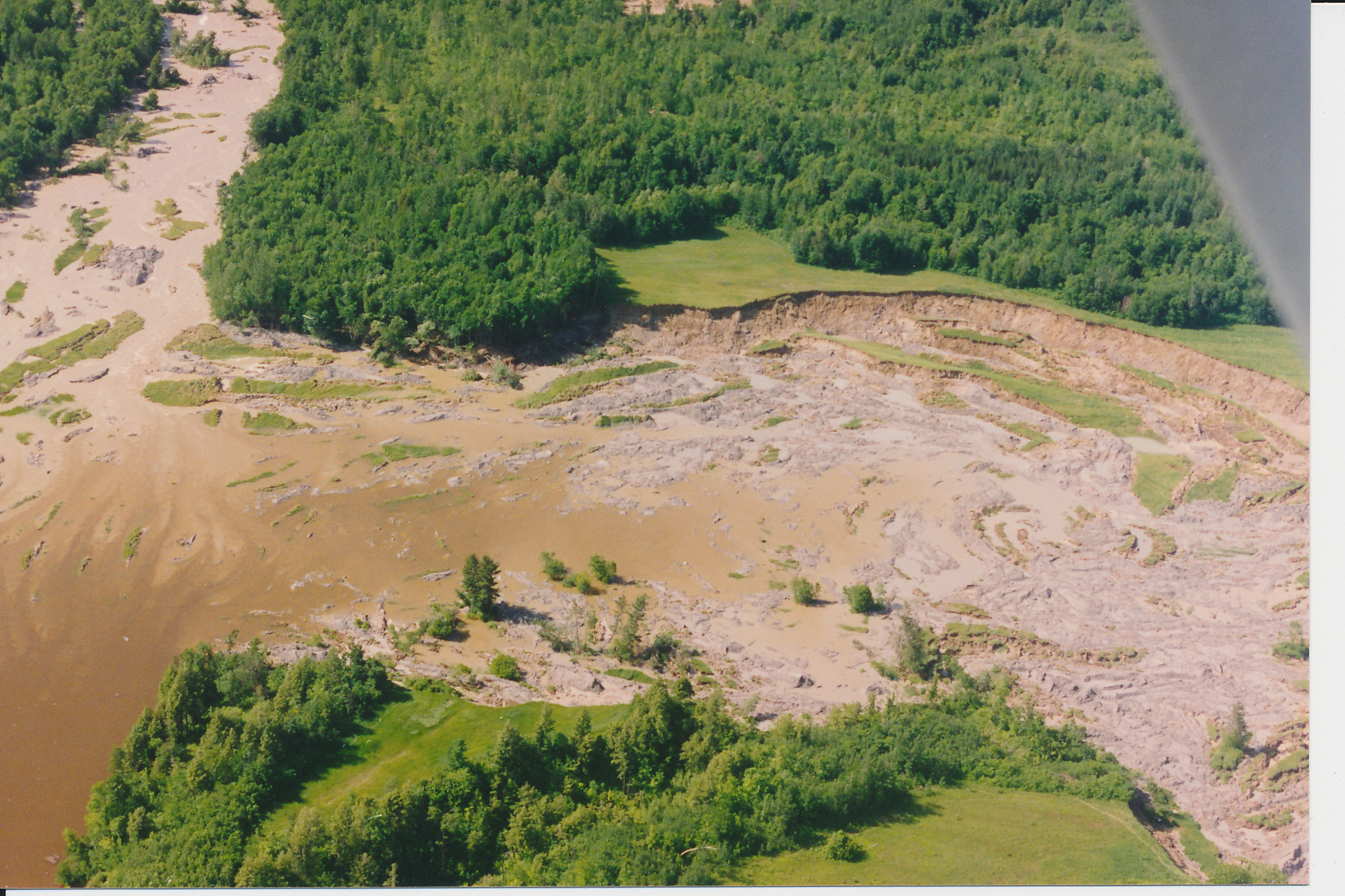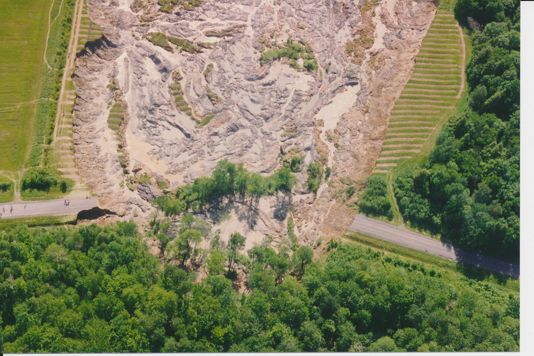 The most recent landslide occurred on June 20, 1993, five hundred metres from the main street of the former Hamlet of Lemieux. The failure involved 2.5 to 3.5 million cubic metres of sand, silt, and clay flowing into the South Nation Valley, inundating 3.3 km of the valley bottom and damming the South Nation River for four days. The landslide created a scar 320 m wide, 680 m in length, and 10 to 20 m deep.