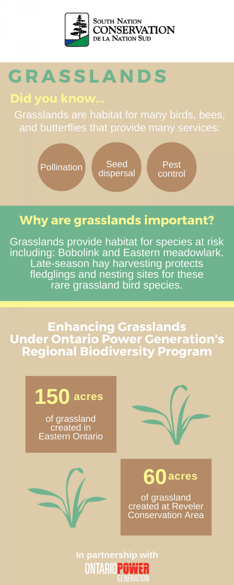 To date, SNC has created grasslands on three SNC owned properties and a fourth under agreement with the St. Lawrence Parks Commission at the Upper Canada Migratory Bird Sanctuary. To learn more about the grasslands SNC has created, check out the grasslands factsheet.