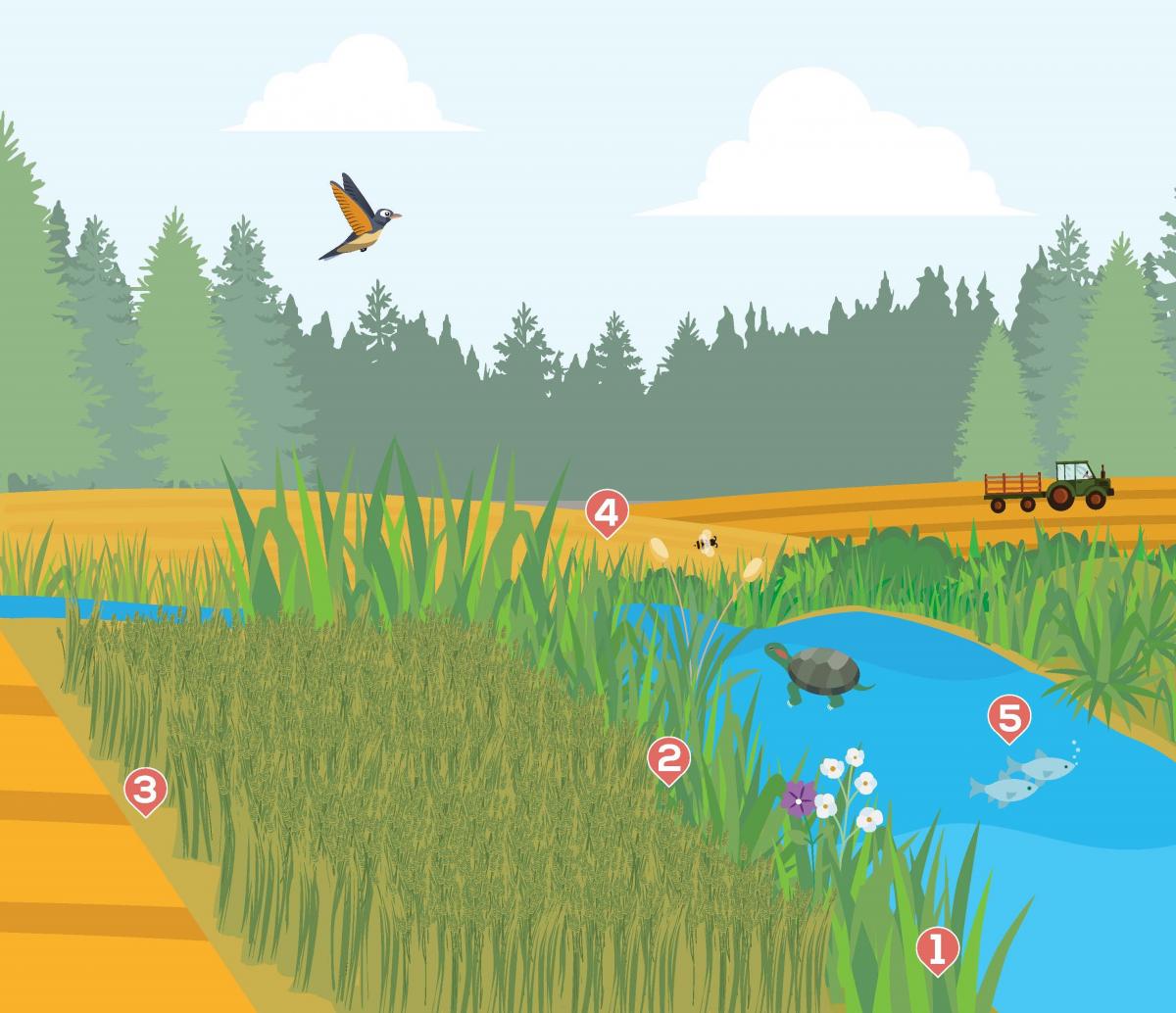 Native edible trees and shrubs were planted alongside drains and can be harvested by the property owner, mixed native grasses are planted on the other side of the drain to facilitate future drain maintenance and can also be harvested. Incentives for best management practices, such as buffers, are available from SNC’s Clean Water Program, the Ottawa Rural Clean Water Program and Alternative Land Use Services (ALUS) - Ontario East.