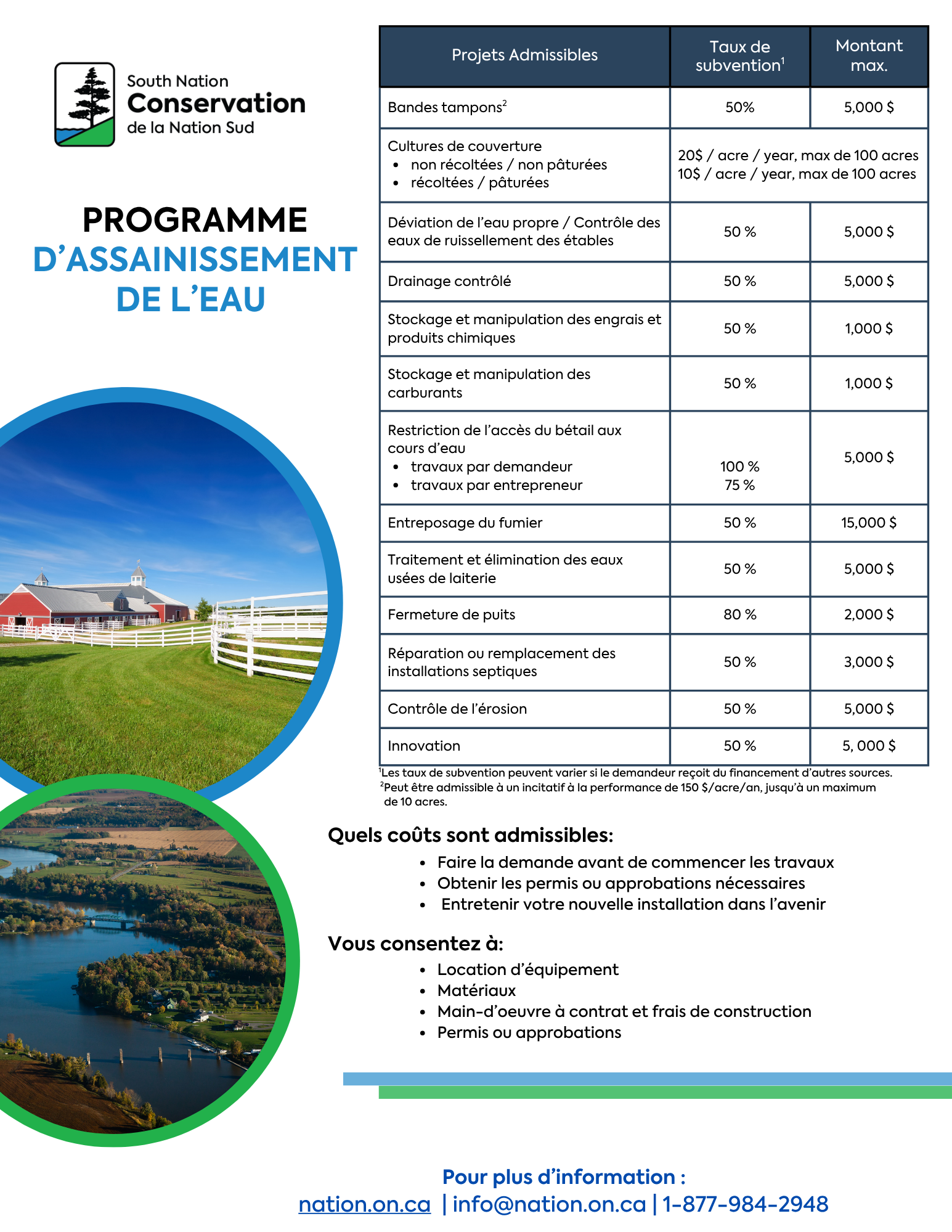 Le Programme municipal de subventions pour l’assainissement de l’eau en milieu rural de la ville d’Ottawa contribue à améliorer la qualité de l’eau en établissant des partenariats avec les communautés pour réduire la contamination de l’eau sur les terres agricoles et rurales. Le programme offre du financement pour la mise en œuvre volontaire de mesures visant à améliorer la qualité de l’eau de surface et des eaux souterraines. Le Programme offre des subventions d’un maximum de 15 000 $ pour couvrir de 50 à 90 % des coûts admissibles. Les offices de protection de la nature qui exercent leur compétence sur le territoire de la ville d’Ottawa (vallée de la RideauThis link opens in a new window, vallée de la Mississippi This link opens in a new windowet vallée de la Nation Sud) mettent en œuvre le programme en partenariat avec l’Association pour l’amélioration des sols et récoltes de l’Ontario This link opens in a new windowet la ville d’Ottawa.
