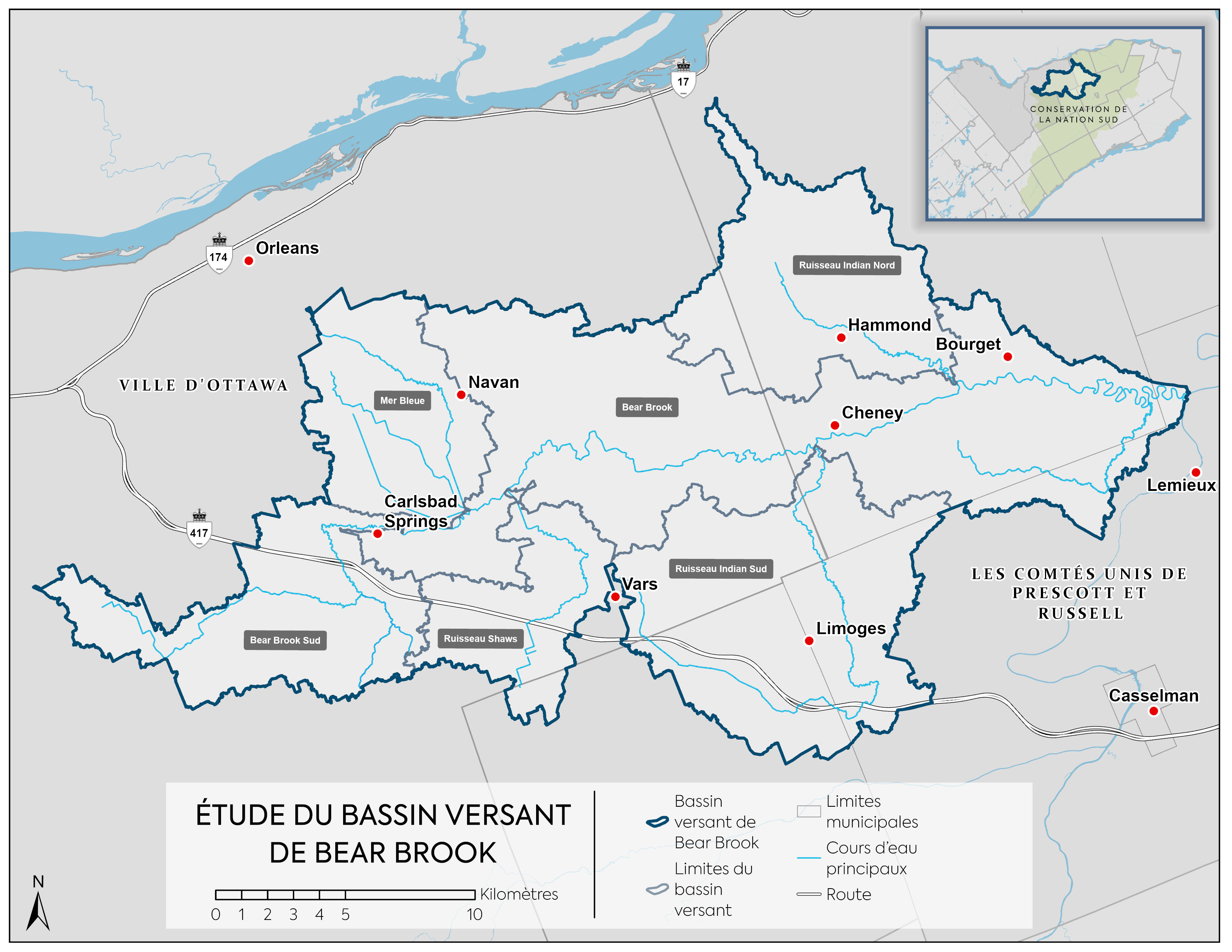 Des bassins versants sains favorisent la biodiversité, réduisent les risques d'inondation et d'érosion, procurent de l'eau propre et aident les collectivités à s'adapter aux changements climatiques. Le bassin versant de Bear Brook, qui s'étend sur 488 km² de zones urbaines, de terres agricoles, de forêts et de zones humides à Ottawa et à Prescott et Russell, est confronté à des pressions croissantes liées au développement, à l'agriculture et aux changements climatiques. Cette étude permettra de déterminer les mesures à prendre pour protéger la santé du bassin versant tout en favorisant une croissance durable.