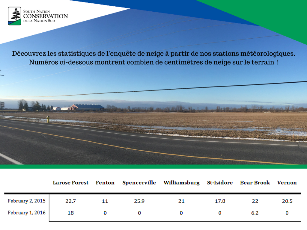 Cette information est également utile comme outil de comparaison des conditions annuels. Le tableau ci-dessous montre la différence dans la quantité de neige présente au stations de surveillance en février 2015 et 2016, les valeurs représentent le nombre de centimètres de neige sur le terrain.